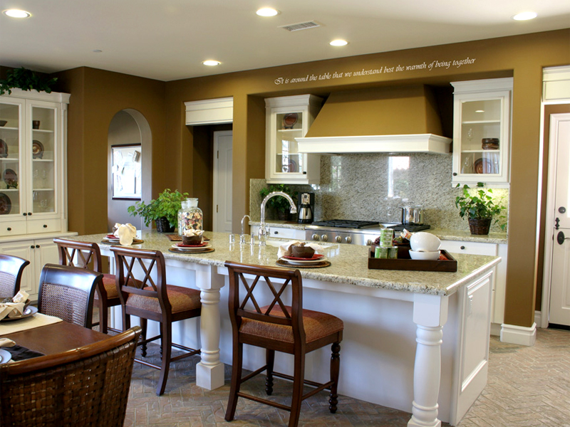 This enormous kitchen’s color theme is ochre brown and white, so we chose our decorative lettering in White, 2 inches high, using the Lettering Style Vivaldi (General category). Our chosen quote was “It is around the table that we understand best the warmth of being together.” We placed the quote on the soffit above the sloped chimney above the stove and centered it between the beams.