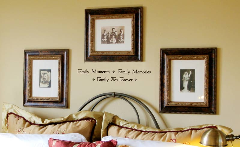 We love to look at photo albums and pore over old pictures of family and friends. They’re a great way of knowing about our past and putting together the missing pieces of our genealogy puzzle. Here’s a unique way to recreate that nostalgia, and preserve and relive those memories in your guest bedroom with the use of our decorative lettering and art.We took several cherished antique family photos, encased them in a burlwood frame with gold fillet, and hung them on the wall over the headboard. To provide that extra perfect touch, we accentuated the frames with decorative lettering with the words “Family Moments, Family Memories, Family Ties Forever.”Notice how the decorative wall art ties in perfectly with the photographs without overwhelming them. We chose the Rudolfo (Spanish Category) Decorative Lettering Style in a 2-inch height and put in some Diamond Motif lettering art to separate the phrases.The overall effect is tasteful and nostalgic without being cheesy, and it provides the perfect welcoming atmosphere for your visiting relatives. They’re sure to love this room with its decorative wall art, and it’s actually really easy to make!Why don’t you plan a weekend project like this for your guest bedroom. We have an entire gallery of decorative lettering quotes, fonts and colors for you to choose from. We’ll send you your chosen lettering, plus free practice letters so you can experiment before you attempt the main project. To transfer your decorative lettering to your wall, all you need to do is to find a place in your guest bedroom, position your letters and tape the lettering against the wall, flip it upwards and peel off the backing paper, let the lettering strip fall back in place, then rub it against the wall with the plastic squeegee that we provide you. Next, you peel off the backing paper and voila, you’re done!Feel free to browse through our Idea Gallery for more decorative lettering ideas, and don’t forget to sign up for our Newsletter to get monthly specials and ideas in your email. We go out of our way to make it easy for you to personalize your world. You can actually create your own quote and we’ll pre-space it for you. If you’re the meticulous kind (just like us) who needs to see the best option in fonts and colors, don’t worry. You can preview your chosen lettering and change it until you’re satisfied before you finalize your order. Have fun browsing!