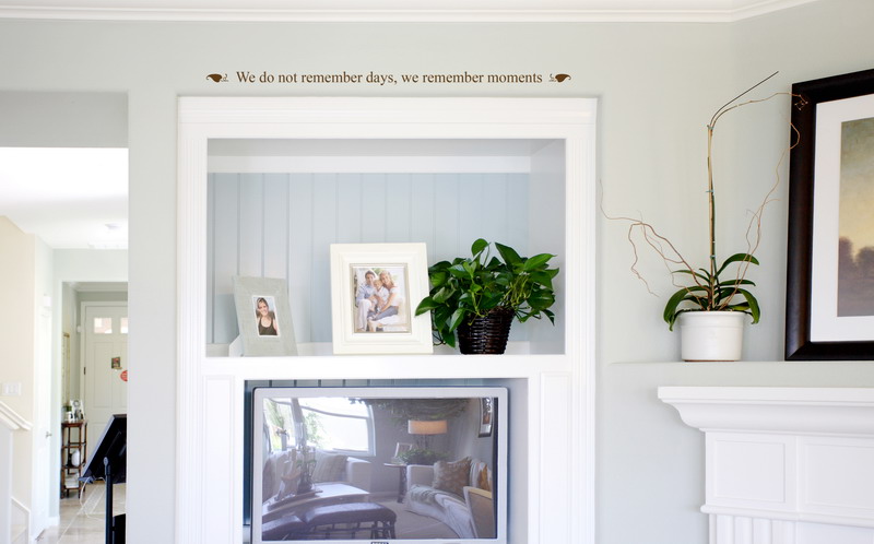 Art: Leaf Pair A and B (2-inch, Chocolate Brown)Most of us like to keep a little display of photographs somewhere in the house – in the bedroom, on top of the piano, or on a little display cabinet in the living room. When we select the photographs for this display, we usually choose the ones that are most memorable to us – those taken with loved ones, or pictures of spontaneous events caught on camera. Many times, we also add little mementoes that are related to the event or the person. These photo displays remind us of the pleasant times we spent, and whether the people we love are still living or not, they’re always there, through these photographs.One way of adding a touch of color and art to your photo display is to place decorative lettering as an accent. Choose a quote – either one associated with the photographs, or one that your loved one used to say. We chose “We do not remember days, we remember moments” for this display in the family room, where we positioned our decorative lettering above the built-in display case. We used the Times Decorative Lettering Style in Chocolate Brown, 2 inches high, and placed Leaf Pair A and Leaf Pair B Lettering Art of the same size and color on each end. Notice that the decorative lettering – because of the size, style, and color – acts as an accent but does not detract from the real display – the photographs. This is a very effective and cost-effective way of adding touches of color to any room in your house. You can place the decorative lettering as a one-line quote, or divide it into two or more lines.Our decorative lettering has the look and effect that hand-painted stenciling gives, at much less the time, cost, and effort. This is a project you can do yourself within a few minutes, and one that is also quite easy to remove when you decide that you’d like to repaint your wall or change the quote with a new one. You can also add little accents through our Decorative Lettering Art, which can be related to the quote or chosen just for the visual effect. Our decorative lettering and art are priced by the letter, so you can either go to town with a bigger size or select a small one – it’s your choice.