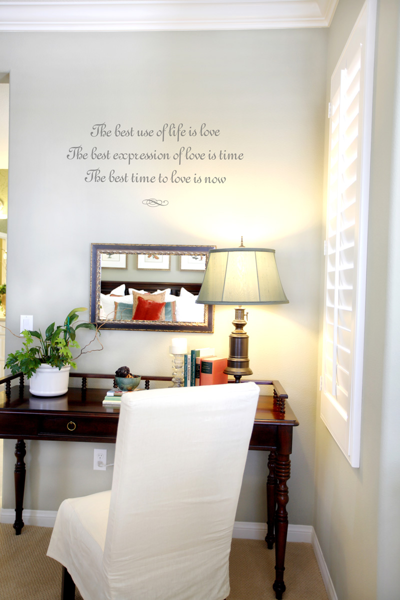 Art: Fancy Swirl (3 inches)How many times have we heard from a friend about a loved one leaving this world suddenly before our friend could say how much she loved him/her? It may have happened to us too. Very often, because of the pressures of work and other things we neglect to tell and show our loved ones how much we appreciate them and love them. Perhaps too, if you’re not very vocally expressive, you don’t think about saying your feelings outright, and forget that people like to hear the words directly from us. We get jolted into realizing that we never did say anything only when it’s too late.February, the Month of Love, is the perfect way to start making a habit of expressing our feelings for the ones we love and hold dear. We felt that a subtle reminder to ourselves helps, and that this little nook in the bedroom, above the writing desk, is a great place for that reminder. Our project features the quote “The best use of life is love. The best expression of love is time. The best time to love is now.” We used decorative lettering in the font French Script, with a Charcoal gray shade and 3 inches in height, to create this beautiful wall décor. Below the 3-line quote we placed the Fancy Swirl – Lettering Art – 0-4 lettering art, also 3 inches high.The effect is a subtle, understated wall embellishment that provides an accent to your wall without grabbing attention away from the rest of the room. Delicate without looking too feminine, it’s a perfect decorative addition to the master bedroom.Decorative lettering can be as grand or as simple as you want it. The great thing about decorative lettering and wall art is that you can experiment on your computer screen to see which one you like best before finalizing your order. You can choose from our gallery of quotes, which we’ve categorized by theme, by room, and by language. This makes it easier for you to search for the perfect quote for your project. You can also browse through our Idea Gallery and Photo Gallery where you’ll find loads of ideas if you don’t know where to start. And, throughout our website, you’ll see photos of how satisfied customers did their decorative lettering projects in their own homes.When you order decorative lettering from Wise Décor, you have a choice of paying by credit card, Paypal, or gift certificate. If you pay by credit card, your order will be shipped no more than 3 business days after you place your order. Take a tour of our site today and see how you can personalize your home without putting a big hole in your wallet. If you’ve got questions, feel free to email us at help@wisedecor.com and we’ll be happy to answer your queries.