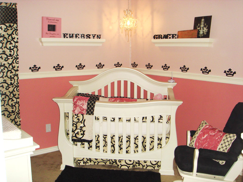 We received this photo from a very satisfied customer. She loved the way the room looked with the crown lettering art she purchased from WiseDecor. We love the way it looks also. She applied the crowns along the wall from one corner to the other. They were the perfect border. They were above the white strip of wooden molding that is in between the top white wall and the lower pink wall. The white cot looks perfect in the corner.